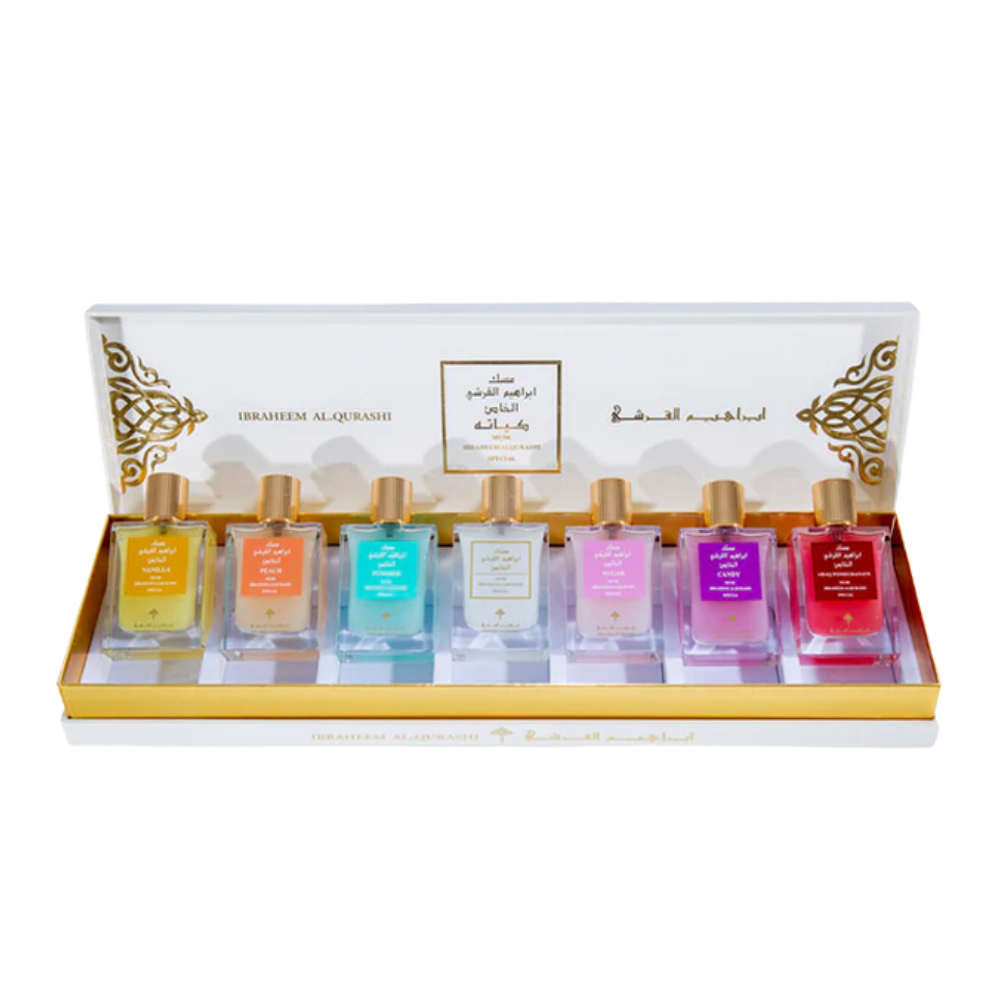Avez-vous cherché à accentuer votre look? Nous vous offrons le Collection Spéciale de Musc d’Ibraheem Al.Qurashi qui contient 7 parfums musqués variés, conçus par des experts. Les odeurs intenses et durables s’adaptent à chaque situation de votre journée, dans un emballage élégant, parfait pour offrir en cadeau.